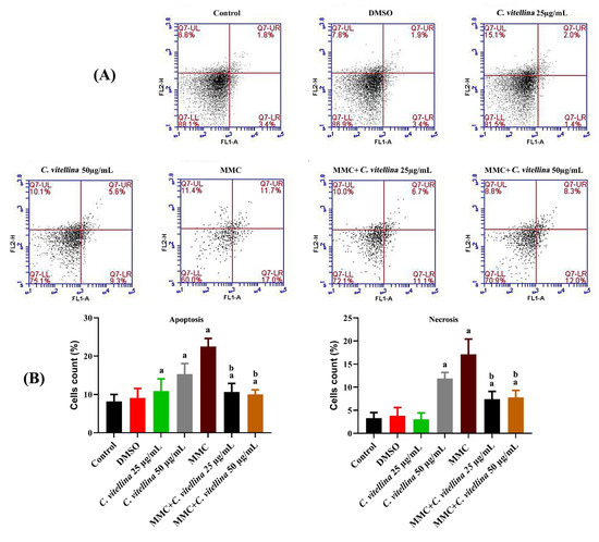 The flow cytometric analyses after Annexin-V FITC/PI labeling were performed to assess the protective effect of C. vitellina extract against MMC-induced cell death through apoptosis or necrosis in HPBL. Results are presented in Figure 3A,B, where the significant (p ≤ 0.05) anti-apoptotic (early and late) cells’ accumulation among the extract co-treated groups compared to the MMC-treated group was evidenced. The anti-apoptotic effect in the co-treated groups reached about 55% and 53.7% for 25 and 50 µg/mL of the extract respectively, when compared with MMC-treated cells. However, all treated groups showed significant (p ≤ 0.05) apoptotic populations (early and late) lesser than MMC group records. The results revealed a significant (p ≤ 0.05) elevation of necrotic events in all treated groups except the lower concentration of the extract (25 µg/mL). The significant (p ≤ 0.05) protective effect towards the necrotic properties in the extract co-treated groups was shown with up to 56.5% and 54% for 25 and 50 µg/mL of the extract respectively when compared with MMC-treated cells (Figure 3B).
