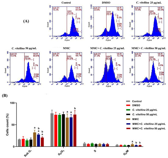 The effect of C. vitellina on the cell cycle phases of treated HPBL was analyzed using flow cytometry. Following 24 h of different treatments, cells were digested with trypsin (1×) and washed with ice-cold PBS, fixed in ethanol and labeled with PBS containing propidium iodide (1 mg/mL) and RNase A (200 μg/mL) for 10 min. The cells’ percentage in sub-G1, G0/G1, S, or G2/M phases was evaluated using DNA analysis program MODFIT (Verity Software House, Topsham, ME, USA, version: 2.0). Cell cycle analysis was performed using BD Accuri™ C6 flow cytometer, San Jose, CA, USA.