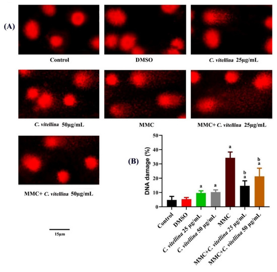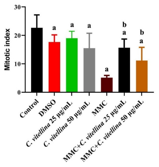 Cytotoxic medications, belonging to various schemes of cancer treatments, are an important intervention to combat cancers [25]. However, the majority of chemotherapeutic agents cause adverse effects such as genotoxic, carcinogenic and teratogenic impacts in vivo and in vitro [26], owing to the genetic alterations produced by their interactions with specific biological molecules in normal cells followed by the generation of free radicals [27]. Mitomycin C (MMC), a bifunctional alkylating agent isolated from Streptomyces caespitosus, is one of these applied antitumor drugs [28]. MMC causes DNA-cross linkage leading to genotoxicity and cancer by superoxides and hydroxyl radicals’ production [29,30]. It induces genotoxic and oxidative DNA damages, single/double DNA-strand breaks and apoptosis [31,32]. Chromosomal aberrations, sister chromatid exchanges and elevated micronucleus frequency in human lymphocytes were also reported [33]. Applying natural extracts enriched with antioxidants may facilitate the repair processes or neutralize the damaging factors that affect DNA molecules [34,35]. Besides, they can reduce the genotoxic effects and modulate the mechanisms of the organism’s defense by which it can avoid the incidences of cancer and other mutation-related diseases.