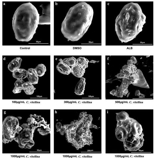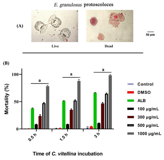 To explore the therapeutic scolicidal effects of C. vitellina extract against protoscoleces of hydatid cysts, four concentrations of the extract (100, 300, 500 and 1000 μg/mL), 50 μg/mL of albendazole (ALB), DMSO and untreated control were used. Briefly, 2 × 103 /mL of the protoscoleces were incubated in RPMI 1640 medium at 37 °C for 0.5, 1.5 and 3 h. At the end of each incubation time, the media were carefully discarded then set, to define the viability of protoscoleces.
