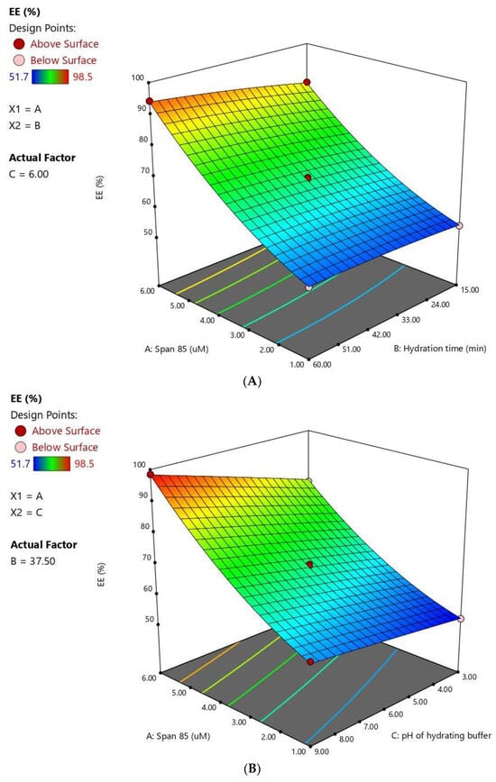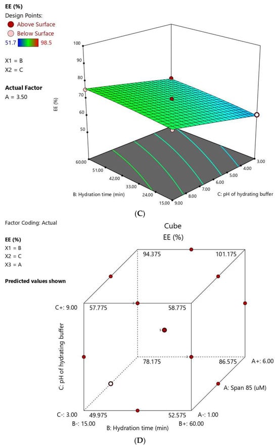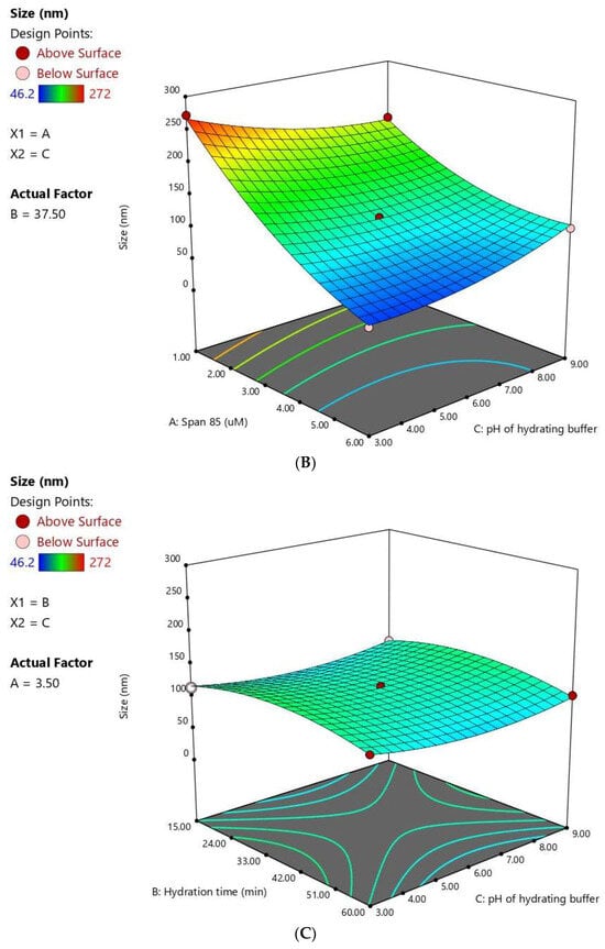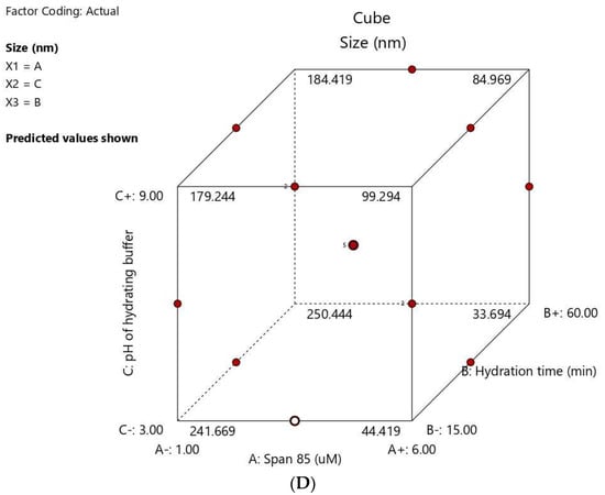 | Variables | X1: Span® 85 conc. (µM) | X2: Hydration Time (min.) | X3: Hydrating Buffer pH |