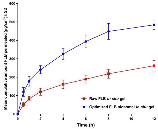 3.4. Characterization and Ex Vivo Permeation of FLB Niosomal In Situ Gel