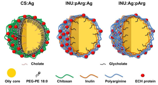For the second prototype, pArg was selected as a polymer shell due to the penetrating properties of this polypeptide, which could help crossing the mucosal barrier [21]. In the pArg NCs, a first layer of hydrophobized INU and sodium glycocholate were used to increase the stability of the naoemulsion (NE), whose core was again a mixture of linoleic acid and Miglyol® 812. Afterwards, antigen was adsorbed onto the pArg surface. However, the antigen could also be added at the surface of the INU before adding the pArg shell, entrapping it in a sandwich-like arrangement [11]. This engineering strategy allowed obtaining two different vaccine prototypes, one with the antigen adsorbed on the surface (INU:pArg:Ag) and another one with the antigen protected by a polymeric bilayer (INU:Ag:pArg) (Figure 1 and Table 1), which can influence the vaccine performance, the reason why we considered it interesting to be studied [11].