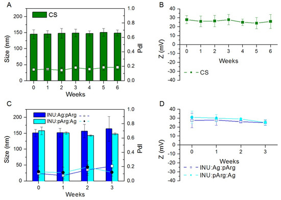 Size (bars), PdI, and Zeta-potential (lines and symbols) of Imiquimod-loaded CS (A,B), INU:Ag:pArg and INU:pArg:Ag (C,D) nanocapsules stored at 4 °C at different time points. Due to the reduced stability of the CS nanocapsules after antigen adsorption (Figure S1), the nanocapsules were tested in the absence of the antigen. Size and PdI were measured in ultrapure water and Zeta-potential in 1 mM KCl. Ag: Antigen, CS: Chitosan, INU: Inulin, pArg: Polyarginine.