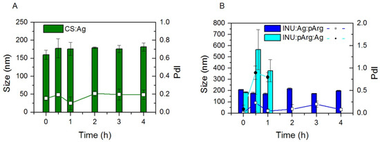 In order to be able to draw adequate conclusions from the in vitro experiments, the stability of the NCs was tested in complete culture medium by recording size and PdI at 4 different time points (Figure 3). CS:Ag and INU:Ag:pArg NCs were stable at all the time points recorded (4 h), whereas the stability of INU:pArg:Ag NCs was limited to less than 30 min, but presumably long enough to allow particle internalization and drainage to the lymph nodes, which usually takes place in the first minutes after administration [24].