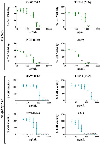 Percentage of cell viability of RAW 264.7, macrophage-differentiated THP-1, NCI-H460, and A549 incubated with different concentrations of CS and INU/pArg nanocapsules for 24 h. CS: Chitosan, INU: Inulin, pArg: Polyarginine. Statistical significance: * P ≤ 0.05, ** P ≤ 0.01, *** P ≤ 0.001, **** P ≤ 0.0001.