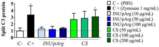 Equal volumes of plasma, PBS, and samples were mixed and incubated at 37 °C for 1 h. Zymosan at a final concentration of 1 mg/mL and PBS were used as positive and negative controls, respectively. The NCs were tested at three different concentrations (50, 100, and 200 µg/mL for CS NCs and 10, 50, and 100 µg/mL for INU/pArg NCs).