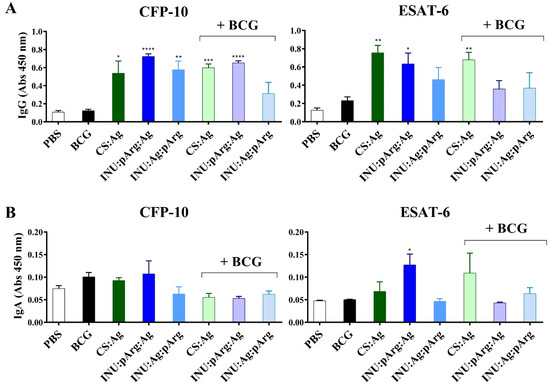 Regarding IgA titers, in general, they were insignificant and only the INU:pArg:Ag prototype induced specific IgA antibodies against the ESAT-6 antigen. Interestingly, for the CS:Ag NC prototype, previous priming with the BCG vaccine induced similar or even higher antibody titers, but the contrary was observed for both INU/pArg NC prototypes. In general, previous immunization with the BCG vaccine reduced the antigenicity of the INU:pArg:Ag and INU:Ag:pArg prototypes (Figure 8).