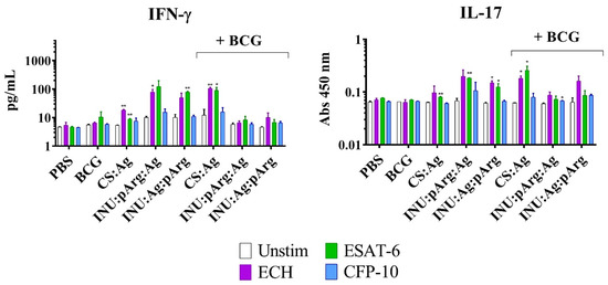 IL-17 and IFN-γ release from splenocytes of immunized mice after an antigen in vitro recall experiment. The splenocytes were incubated with CFP-10, ESAT-6, or the ESAT-6/CFP-10 fusion protein (ECH) and the supernatants were collected for cytokine measurement and were compared to the non-stimulated (Unstim) samples. Mice previously immunized with BCG (+BCG) or not, received PBS (as negative control), CS:Ag, INU:pArg:Ag, or INU:Ag:pArg as vaccine prototypes. IL-17: interleukin 17, IFN-γ: interferon gamma, Ag: Antigen, CS: Chitosan, INU: Inulin, pArg: Polyarginine. Statistical significance: * P ≤ 0.05, ** P ≤ 0.01, *** P ≤ 0.001.