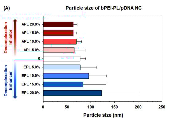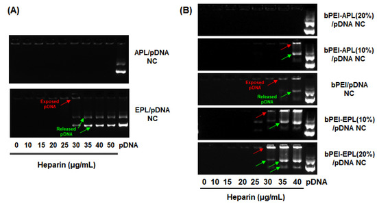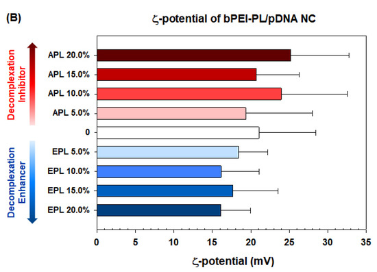 Prior to the evaluation of decomplexation of the bPEI-PL/pDNA NCs, the different decomplexation rates of the PL-based NCs were reconfirmed because the experimental conditions (e.g., incubation time) in this study were different from those in a previous study [24]. As shown in Figure 1A, after preparing APL/pDNA NC and EPL/pDNA NC at a fixed N/P ratio of 5, the NCs were exposed to heparin in 150 mM aqueous NaCl at 37 °C for 30 min. When heparin was not present, the two PL/pDNA NCs completely shielded the pDNA because exposed or uncomplexed pDNA was not detected by EtBr-mediated fluorescence. However, when increasing the concentration of heparin from 0 to 50 μg/mL, the two PL/pDNA NCs showed different decomplexation or pDNA release patterns. APL/pDNA NC did not show any decomplexed (exposed and released) pDNA from the NC at 50 μg/mL heparin, whereas EPL/pDNA NC partially released pDNA (approximately 40%) at 30 μg/mL heparin and substantial pDNA (>75%) was released at heparin concentrations greater than 35 μg/mL. These results indicate that APL has a strong electrostatic attraction to pDNA, unlike the weak pDNA electrostatic attraction of EPL, which is in agreement with previous results [24]. Thus, APL and EPL could be used as a decomplexation inhibitor and a decomplexation enhancer, respectively.