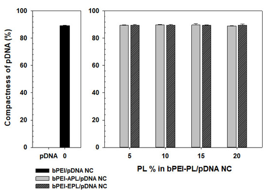 Compactness of pDNA in bPEI-PL/pDNA NCs. The data are expressed as the mean ± standard deviation (SD) (n = 3).