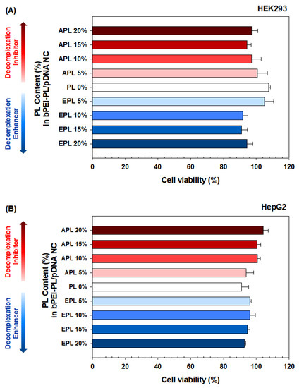 Cell viability of bPEI-PL/pDNA NC-transfected (A) HEK293 cells and (B) HepG2 cells. Cell viability (%) is expressed as the mean ± standard error (SE) (n = 4).