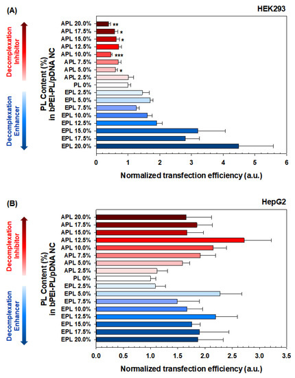 When bPEI-PL/pDNA NCs were applied to easy to transfect HEK293 cells, their effects on the TE were obviously affected by either the decomplexation inhibitor (i.e., APL) or decomplexation enhancer (i.e., EPL) (Figure 5A). Namely, with increasing PL content in the NCs, the normalized TEs (NTEs) of bPEI-APL/pDNA NCs gradually decreased from 1.01 (for 2.5% APL) to 0.38 (for 20% APL), whereas the NTEs of bPEI-EPL/pDNA NCs gradually increased from 1.45 (for 2.5% EPL) to 4.48 (for 20% EPL). These results indicate that faster decomplexation of bPEI-based polyplexes, compared with slower decomplexation, could result in higher gene expression in an easy-to-transfect cell.