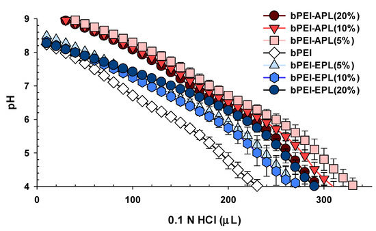 Proton buffering capacities of the mixtures of bPEI and PL in 150 mM NaCl. The data are expressed as the mean ± SD (n = 3).