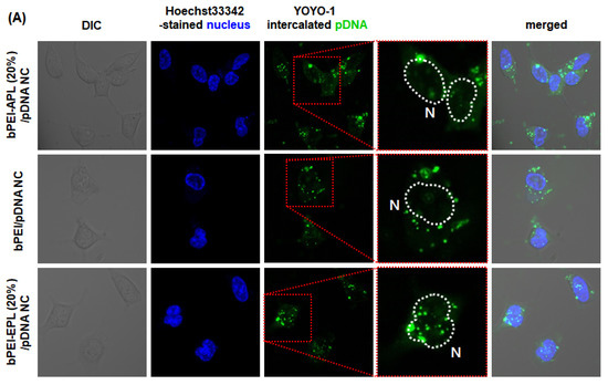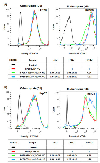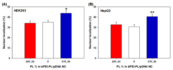 To support the NP/CU results of bPEI-PL/pDNA NCs calculated by flow cytometry (Figure 7), its nuclear localization was further visualized and estimated by confocal microscopy (Figure 8 and Figure 9). As shown in Figure 8A,B, bPEI/pDNA NC was mostly present in the cytosol, but the NC was rarely found in the nucleus. Compared to bPEI/pDNA NC, more APL (20%) and EPL (20%) were localized in the nucleus. In particular, EPL (20%) was distributed in the nucleus to a greater extent than APL (20%). In addition, the calculated nuclear localization percentages of APL (20%) and EPL (20%) in HEK293 cells and HepG2 cells were 34.2% and 32.7%, respectively, for APL (20%) and 43.8% and 40.5%, respectively, for EPL (20%) (Figure 9A,B). The nuclear localization values of EPL (20%) were 1.28-fold (in HEK293 cells) and 1.24-fold (in HepG2 cells) higher than those of APL (20%). These nuclear localization confocal results of the APL (20%) and EPL (20%) agree with their flow cytometry results. The results indicate that the nuclear localization trends of bPEI-PL/pDNA NCs are not affected by the transfection difficulty of the cells.