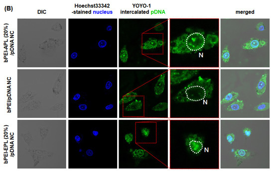 To understand the different TE effects of bPEI-PL/pDNA NCs in the two different cell lines, their cellular uptake (CU), nuclear uptake (NU), and subcellular localization were monitored because these characteristics, along with decomplexation, strongly affect their TE. In particular, bPEI-APL (20%)/pDNA NC and bPEI-EPL (20%)/pDNA NC were used as the model NCs of bPEI-PL/pDNA NCs, and are simply called as APL (20%) and EPL (20%), respectively. In HEK293 cells, APL (20%) exhibited a similar CU to the control (i.e., bPEI/pDNA NC), whereas the CU of EPL (20%) was approximately 3% lower than that of the control and APL (20%) (Figure 7A). The results might be caused by different physicochemical characteristics (e.g., size, zeta potentials) of bPEI-PL/pDNA NCs because EPL (20%) (123 nm, 16.1 mV) had a relatively larger size and lower zeta potential than those of APL (20%) (63 nm, 25.2 mV) and the control (78 nm, 21.1 mV). However, the NU of APL (20%) was 0.91-fold and 0.76-fold lower than those of the control and EPL (20%), respectively (Figure 7A). Interestingly, although EPL (20%) had a similar CU as that of APL (20%) (0.97 versus 1.00), the former represented 1.31-fold higher NU than the latter. For easier comparison, when the NU is divided by the CU, the nuclear preference to CU (NP/CU) of EPL (20%) was 1.35-fold higher than that of APL (20%) (1.23 versus 0.91). These results could be influenced by the different endosomolytic activities of the two PLs because EPL has a proton buffering-mediated endosomal escape ability, unlike APL (Figure 6), and both APL and EPL have nuclear translocating activities after endosomal escape [7,24]. The additional endosomal escape activity of EPL could help EPL (20%) escape from endolysosomal compartments earlier than the control, whereas the lack of proton buffering power from APL could cause APL (20%) escape from endolysosomal compartments later than the control.