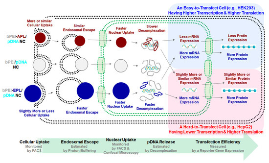 Although the same nonviral gene complexes have been used in cells, their different transfection efficiencies have been reported depending on the cell type [26,27,28]. This fact indicates that the gene release rates of gene complexes could differentially affect cells to express transgenes depending on the cell. HEK293 cells, a human embryonic kidney cell line, have often been used to transfect genes of interest in biological experiments and to produce recombinant proteins due to their high and stable gene expressing capability [29,30]. On the other hand, although HepG2 cells (a human hepatocellular carcinoma cell line) have been used as a well-known and suitable in vitro model of human hepatocytes to understand cellular functions and disease mechanisms [31,32], their gene of interest expression levels are poor. Thus, in this study, when transfecting easy to transfect cells (i.e., HEK293 cells) or hard to transfect cells (i.e., HepG2 cells), the effects of decomplexation on transfection efficiency were investigated. To avoid endosomal sequestration of the gene complex and to maximize the difference between gene-holding and gene-releasing capability, either APL as a slow gene-releasing (i.e., strong gene-holding) carrier or EPL as a fast gene-releasing (i.e., weak gene-holding) carrier was incorporated into branched polyethylenimine (bPEI; the gold standard polymeric transfection reagent)-based gene complexes. After the resultant ternary bPEI-APL/pDNA and bPEI-EPL/pDNA complexes were constructed, their physicochemical characteristics (e.g., size, zeta potentials, gene condensation) and biological characteristics (e.g., cellular uptake, nuclear uptake, transfection efficiency) in HEK293 or HepG2 cells were investigated.
