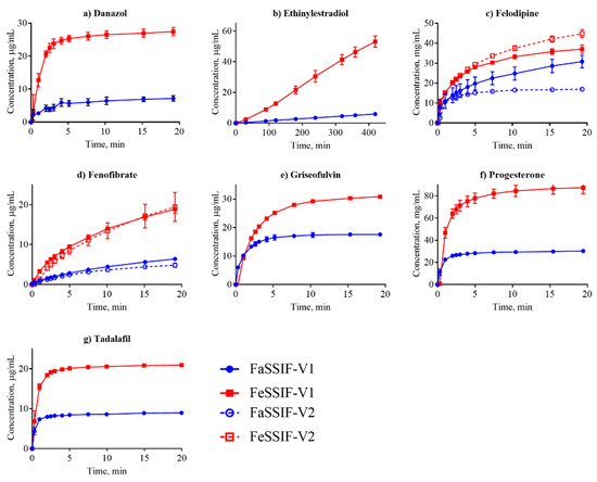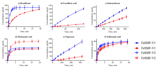 Dissolution profiles in the FaSSIF-V2 and FeSSIF-V2 media could only be established for seven of the compounds (Figure 1, Figure 2 and Figure 3): mefenamic acid, tolfenamic acid, carvedilol, dipyridamole, noscapine, felodipine, and fenofibrate. Additionally, astemizole, ethinylestradiol, naproxen, and tadalafil could be measured in FaSSIF-V2 (Table 3). Several issues prevented IDR determination in these V2 media for the other compounds: either standard curves could not be established or dissolution curves were highly scattered and non-reproducible. The second version of the biorelevant media were developed originally to more closely mimic the composition of the human intestinal environment based on in vivo data [53]. The buffer system was changed from phosphate buffer in FaSSIF-V1 to a maleate buffer in FaSSIF-V2 and FeSSIF-V2 (Table 2) to reflect the physiologically relevant buffer capacity and osmolarity [54]. However, maleic acid exhibits a strong UV absorbance <250 nm, which prevents analysis of compounds with UV detection wavelengths <300 nm. Due to the remaining small IDR dataset in FaSSIF-V2 and FeSSIF-V2, we primarily focused our following data analysis on the IDR dataset compiled in FaSSIF-V1 and FeSSIF-V1.