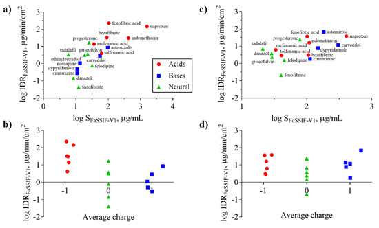 Figure 4 shows IDR as a function of S in FaSSIF-V1 (a) and FeSSIF-V1 (c), respectively. It is clear that higher solubility correlates in general with higher IDR in both media which is described by the classic Noyes-Whitney equation [55] relating dissolution rate to solubility and diffusion: