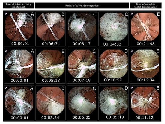 - Graham, D.Y.; Smith, J.L.; Bouvet, A.A. What happens to tablets and capsules in the stomach: Endoscopic comparison of disintegration and dispersion characteristics of two microencapsulated potassium formulations. J. Pharm. Sci. 1990, 79, 420–424. [Google Scholar] [CrossRef]