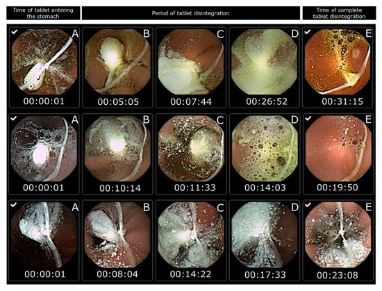 However, in this study, capsule endoscopy was used to study the tablet disintegration of Panadol and Panadol Rapid in beagle dogs. It can be observed that all the tested tablets are submerged in gastric fluid for their entire residence in the stomach. When the tablets disintegrated, their content spread over a large surface area of the epithelial lining covering the stomach. The tablet disintegration time was determined as the time from the tablet entering the stomach to when it was no longer visible from the camera capsule or when the tablet became fully fragmented. The average disintegration time for Panadol and Panadol Rapid was 24.7 ± 4.8 and 16.5 ± 4.3 min, respectively, as can be seen from Figure 3 and Figure 4.
