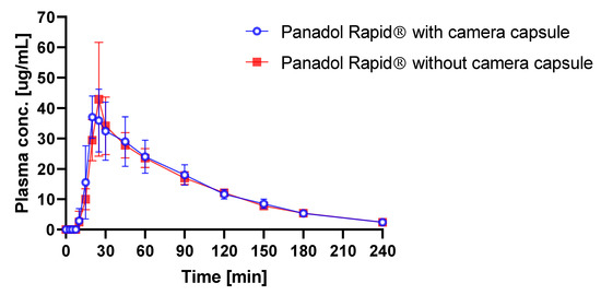 ANOVA was performed on the dose-corrected time–plasma concentration data and showed no statistically significant difference in the Cmax, Tmax, and AUC/dose (p = 0.80, p = 0.51, and p = 0.61, respectively) when administering Panadol Rapid with and without capsule endoscopy.