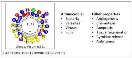 The human antimicrobial peptide (AMP) LL37. Composed of 14 different amino acids arranged to form a partial amphipathic helix (helical wheel) of 37 residues, LL37 (left) has evolved to display multiple functions (right); µH, hydrophobic moment, a measure of amphipathicity.