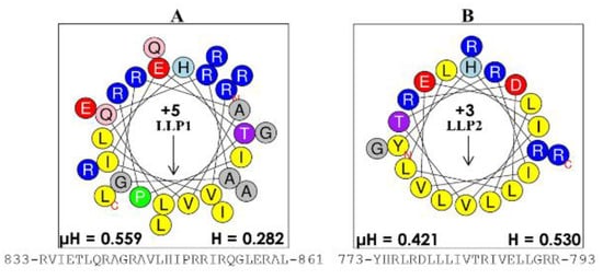 Structures of lentivirus lytic peptides (LLPs). The intracellular domains of the gp41 protein were identified as potential antimicrobial peptides because of their characteristic cationic amphipathic motif, with the helical wheel of (A) the more potent antibacterial LLP-1 (charge of +5) and (B) that of LLP-2 (charge of +3). These LLP domains set the foundation for the engineered AMPs, which we termed engineered cationic antimicrobial peptides (eCAPs) (Figure 3). The number on the left and the number on the right of each sequence indicate the beginning and the end of the primary sequence, respectively, in the protein gp41; µH, hydrophobic moment; H, hydrophobicity derived from the online software heliquest.fr.