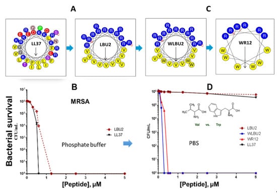 Progression of eCAP structures to overcome limitations of natural AMPs. The helical wheel of LL37 shows remarkable diversity in amino acid composition compared to eCAP LBU2 (A), which displays similar activity to LL37 (B). Sequence optimization of eCAPs (C) using Trp (W) resulted in resistance to saline (D) when the peptides were tested against methicillin-resistant S. aureus (MRSA, B and D). This figure is a summarized adaptation from previously published work [55,71,75,77].