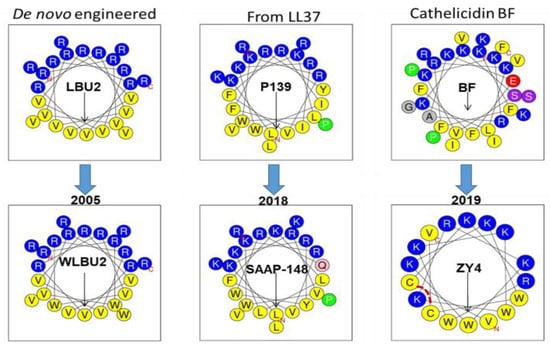 While the design of an AMP always begins with a rational basis, such design is typically implemented with a great deal of trial and error. To illustrate, let us compare WLBU2 with the most recent and promising AMPs. The structure of WLBU2 is based upon three main premises: (i) the optimization of the cationic amphipathic structure will enhance antibacterial potency; (ii) there must be an optimal length for highest antimicrobial potency; (iii) in the context of the helical amphipathic structure, Trp substitutions will enhance potency under physiological conditions [75]. Importantly, we did not have any information that would have predicted the sites for Trp substitution in relation to the potential toxicity to mammalian cells, except for the placement of the Trp residues in the hydrophobic domain of the secondary structure. Thus, while the design of WLBU2 began with a rational basis, an important part of the design resulted from an educated guess. The tendency for trial and error can also be demonstrated in AMP design that uses a template from a natural AMP for modification. As illustrated in Figure 4, two very recent AMPs were obtained from two natural amino acid sequences. Similarly to the use of Trp and few amino acids in WLBU2, SAAP-148 (LKRVWKRVFKLLKRYWRQLKKPVR), although derived from the cathelicidin LL37 (composed of 14 different amino acids), has an optimized cationic amphipathic structure with 24 residues in length [120]. This peptide also displays broad activity against MDR bacteria and moderate lytic effects on red blood cells at concentrations surpassing 10 µM. Similarly, the ZY4 peptide (VCKRWKKWKRKWKKWCV) was derived from a cathelicidin template with a very diverse amino acid composition, which was reduced to a composition of five amino acids (R, K, C, V, and W) and 17 residues in length. Interestingly, the cysteine residues provide a bridge that does not substantially disrupt the helical structure (an important lesson), as shown by the helical wheel projection (Figure 4) and by the three-dimensional (3D) structure [119]. In this case, the disulfide bridge may have a similar effect to that of stapling the peptide [162,163], which may contribute to its activity. Thus, both SAAP-148 and ZY4 show some structural similarities to WLBU2 and could not have been obtained without some level of trial and error 13–14 years after the first study on WLBU2 was published. These three examples (Figure 4) illustrate conceptually the incremental progress in the design of helical AMPs. Therefore, more transformative structure–function studies are necessary despite bold efforts in clinical development (LL37 for melanoma) [161]. Of note, the use of D-enantiomerization and unnatural amino acids, including peptoids, and cyclization of non-helical AMPs are additional strategies that could be effective in enhancing the pharmacological utility of AMPs [100,114,115,116].