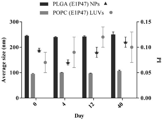 Short-term stability of PLGA (E1P47) NPs and POPC (E1P47) LUVs. Bars correspond to average size measurements and are referred to the left side of the Y axis. Symbols correspond to polydispersity index (PI) results and are referred to the right side of the Y axis. Values are expressed as mean ± SD. (Zav and PI stored at 4 °C; n = 3).