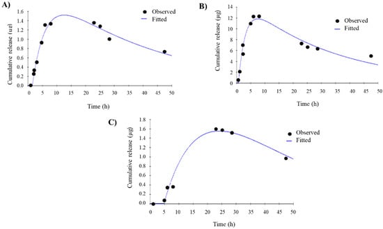 In vitro release profile, measured mass of released peptide (black circles) fitted to a mono-compartmental model (blue lines). (A) Mono-compartmental fitted model of free E1P47; (B) Mono-compartmental fitted model of PLGA (E1P47) NPs; (C) Mono-compartmental fitted model of POPC (E1P47) LUVs.