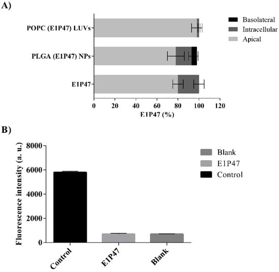 In addition, the free peptide and the PLGA (E1P47) NPs showed the ability to remain in the cell monolayer. These results can be attributed both to the hydrophobic characteristics of the E1P47 peptide as well as to the properties of the polymer. On the other hand, after applying POPC (E1P47) LUVs to the cell monolayer, almost all of the peptide was found in the apical compartment (Figure 3A). According to the results of the in vitro release parameters of the POPC (E1P47) LUVs, the scarce amount of E1P47 peptide found in the cell monolayer could be attributed to the sustained release of the E1P47 peptide from the liposomal carrier since after one hour of exposure the peptide has not been released from liposomes.