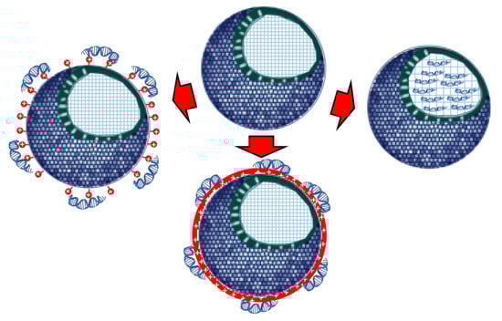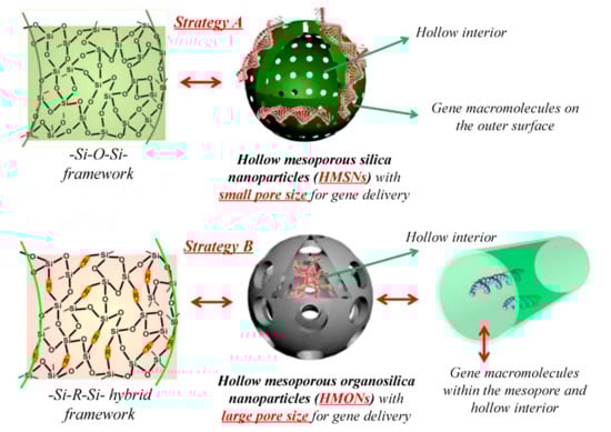 MSNs can also act as gene carriers by introducing the DNA cargo within its mesopores. However, most of the mesoporous materials employed for drug delivery present pores that are too small to carry therapeutically interesting DNA molecules. Therefore, nucleic acids can only be carried on the nanoparticle surface unless MSNs with large enough pores are obtained (Figure 3). For this reason, Gao et al. prepared MSNs with large pore sizes (around 20 nm) that enable the loading and release of plasmids [89]. Zhu et al. later prepared large pore organically-functionalized and PEI-coated hollow MSNs that could also be used to deliver a hepatocyte growth factor (HGF) plasmid into bone marrow-derived MSCs in the context of regenerative medicine [90].