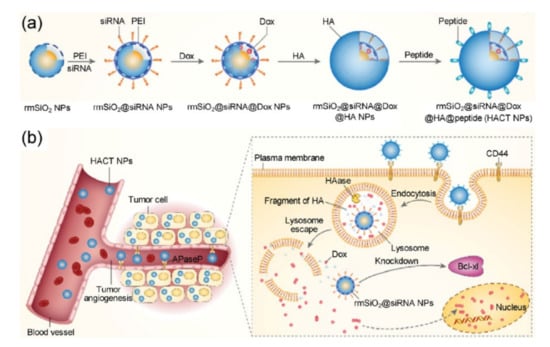 (a) Schematic representation of multilayered hyaluronic acid- polyethyleneimine (PEI)-rattle MSNs, with a cascade of two targeting agents (hyaluronic acid, HA, and peptide) and two cancer therapeutic agents (connective tissue growth factor (CTGF) siRNA and Dox). (b) Schematic representation of the therapeutic mechanism of CTGF siRNA and Dox co-loaded multilayered hyaluronic acid-PEI-rattle MSNs for the treatment of CTGF overexpressing breast cancer. This image is used without modifications from [99]. Copyright© 2017, Springer.
