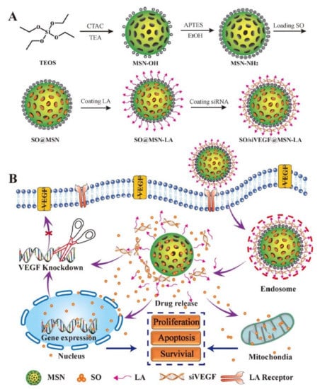 (A) Schematic representation of the preparation procedure of Sorafenib and vascular endothelial growth factor (VEGF) siRNA co-loaded modified MSNs; (B) Mechanism of the therapeutic effect. This image is used without modifications from [115]. Copyright© 2018, American Chemical Society.