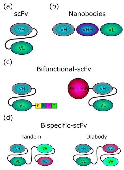 To specifically target such abnormal protein aggregates, a number of antibody fragments that are active intracellularly, called intrabodies, have been recently developed (Table 1). To become intrabodies, in general, antibody portions are specifically modified for localization in intracellular compartments, such as the cytoplasm, the nucleus, mitochondria, or the endoplasmic reticulum (ER) of cells that express them. Intrabodies include single-chain fragment variable antibodies (scFvs). In fact, the antibody Fv region, which is responsible for antibody specificity and binding to a target, can be expressed in the absence of other immunoglobulin domains, and further engineered for the design of therapeutic molecules (Figure 1) [5]. Notably, scFv intrabodies encompass both variable heavy (VH) and light (VL) chains of an antibody, connected by a flexible hinge (Figure 1) [6], and are capable of effectively binding their target antigens. Several other antibody or scFv derivatives against NDs have been developed to be used as intrabodies, such as bifunctional scFvs and bispecific scFvs, as well as camelid VHH, VH, or VL single domain antibodies (nanobodies), which may be more stable, more soluble in the intracellular reducing environment, and have easier access to hidden epitopes than scFvs (Figure 1) [7]. However, despite the proposition of new strategies, the efficient intracellular expression/delivery of these intrabodies remains an unsolved issue.
