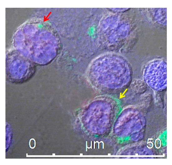 Confocal microscope analysis of HEK293T cells transfected with an expression vector encoding Nefmut fused to an scFv, labeled with an anti-Nef monoclonal antibody and Alexa 488-conjugated anti-mouse IgG antibody. The picture shows intracellular localization of the fusion protein product in intracytoplasmic vesicle aggregates (red arrow) and at the plasma membrane (yellow arrow). DAPI (blue fluorescence) was used to highlight cell nuclei. Scale bar is shown.