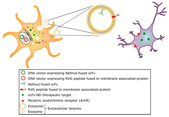 The therapeutic effect of engineered EVs emerging from transduced neuronal cells would also benefit from precise cell targeting. This might be easily achieved by co-expressing with the Nefmut-scFv fusion protein, another chimeric product including portions of proteins that strongly associate with exosome membranes, such as the transmembrane domain of platelet-derived growth factor receptor (PDGF-R) or lactadherin C1-C2 domains, and ligands that specifically bind the cell type of interest. For instance, with glycoprotein CD24 being a potential marker of cell populations affected in PD [116], the engineering of exosomes with both a membrane protein fused to a humanized anti-CD24 scFv and Nefmut-anti-ND scFv would ensure precise targeting of the therapeutic scFv to CD24-expressing cells.
