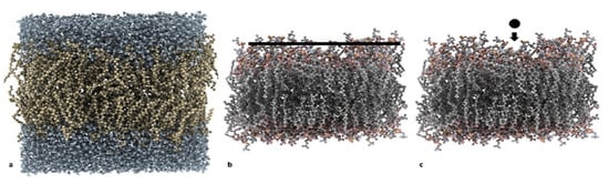 A theoretical 70:30 DPPC:CHOL model bilayer was generated starting from a previously prepared DPPC bilayer equilibrated through a 100-ns MD simulation at 300 K at the constant pressure of 1 atm (NPT). In the DPPC bilayer, 30% of the DPPC molecules were randomly replaced with CHOL molecules. The obtained bilayer was then equilibrated through a 50-ns constant temperature and volume (NVT) MD simulation at 300 K. All molecules were in neutral form. The final bilayer consists of 140 DPPC molecules, 60 CHOL molecules and two water layers, each containing about 3159 water molecules (Figure 1a) [18]. The DPPC:CHOL bilayer was used in three sets of MD and Steered MD (SMD) simulations: