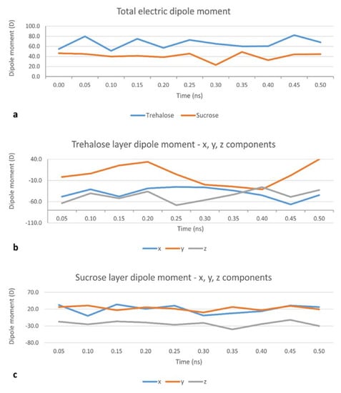 The same procedure was used to calculate the electric dipole moment of a single molecule of sucrose (1.44 D in a vacuum and 1.03 D in water) or trehalose (0.50 D in a vacuum and 1.40 D in water). This increase in the electric dipole moment is in line with results suggesting that trehalose is able to bind, through hydrogen bonds, a large number of water molecules [28]. The same pattern applies when a small cluster of 4 disaccharides is considered. In this case, the electric dipole moment of a cluster of 4 disaccharide molecules in a vacuum is 3.80 D for sucrose and 5.06 D for trehalose. Though, as the average electric dipole moments for any single molecules are comparable (1.68 ± 0.90 D for sucrose and 1.67 ± 0.40 D for trehalose), this seems more attributable to a higher degree of order in the orientation of the dipole moments, the latter result is confirmed by an analysis of the three components—µx, µy and µz—of the total electric dipole moment. Indeed, µz (z being the direction of the bilayer’s normal) for trehalose (Figure 2b) has a higher absolute value and higher weight with respect to the x and y components than for sucrose (Figure 2c). The average µz is −46.6 D for trehalose and −24.6 D for sucrose [28]. This, together with the values of the x and y components (lying in the plane of the bilayer’s surface), translates to a smaller angle between the dipole moment for the trehalose cluster and the bilayer’s normal. Taken together, these results suggest that the cryoprotectant role of trehalose may be attributed to both its well-known ability of forming a high number of hydrogen bonds with water molecules [28] and its ability of forming a highly ordered cluster, which ultimately concur to the disruption of water clusters [29] and which is confirmed by the present calculations also in the proximity of a DPPC:CHOL bilayer.
