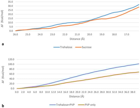 where ∆F is the Helmholtz free-energy difference between the initial and final configurations, W is the work calculated from MD trajectories, the average ⟨ ⟩ens is taken over an ensemble of 10 different trajectories from the same initial conditions, k is Boltzmann’s constant and T is absolute temperature (300 K). A qualitative evaluation of the calculated ∆F, slightly higher for trehalose, suggests a stronger interaction (Figure 3a).