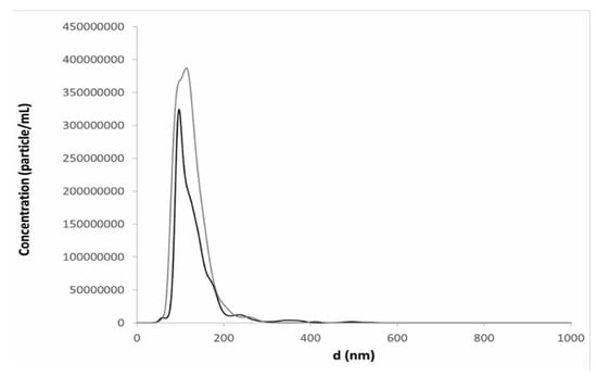 Particle size distribution from Nanoparticle Tracking Analysis (NTA) measurements of resuspended liposomes in the presence of trehalose (black line) and the combination of trehalose and PVP (grey line) after freeze-drying (method B) dispersions with 6% v/v ethanol content: This profile was obtained by plotting the average data obtained after analyses of 3 reconstituted liposome dispersions.
