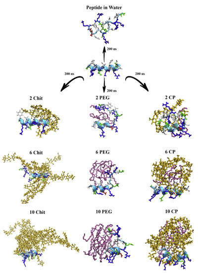 Wu et al. performed all-atom simulations of cecropin P1 grafted to the silica surface via a PEG cross-linker, showing the effect of PEG size and ionic strength on the conformation and antimicrobial activity of the peptide [79,80]. Our group simulated PEGylated magainin 2 and tachyplesin I interacting with lipid bilayers, showing that PEGylation reduces the binding strength between peptides and bilayer surfaces, which occurs more significantly for α-helical magainin 2 than for β-sheet tachyplesin I [81]. Recently, Jafari et al. simulated PEG-encapsulated magainin 2 and found that the PEG–peptide interaction is significantly modulated by aromatic and basic residues of the peptide [82], and Souza et al. simulated the insertion of PEG-encapsulated human beta-defensin-3 to lung surfactant models, showing that PEG chains promote the translocation of the peptide from gas phase to water phase [83]. Asadzadeh et al. simulated GF-17 (17th–32nd residues of LL-37) interacting with chitosan, PEG, or both, showing that the peptide interacts more tightly with PEG than with chitosan (Figure 3), leading to lower helicity in the presence of PEG [84].