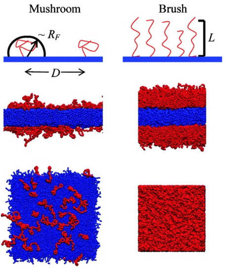 Liposomes, which are synthetic vesicles composed of phospholipid membranes, can transport drug molecules across specific cell membranes and thus have been widely used for drug delivery applications [121,122,123]. To increase solubility and circulating time of drug-encapsulating liposomes, PEG has been often attached to the liposome surface [2], since the first PEGylated liposomal doxorubicin (hydrophobic anticancer drug) was approved by the FDA in 1995 [124]. As the PEG size and concentration increase, encapsulated drug molecules can be more safely shielded from plasma proteins in the bloodstream, but also liposome membranes become unstable [125,126]. Therefore, many experiments have been performed to determine the maximum size and grafting density of PEG that can still maintain liposome stability [125,127,128,129,130,131,132,133,134,135,136,137,138,139,140], which has motivated theoretical studies on the effect of PEG size and grafting density on the conformation and dynamics of PEG chains grafted on the surface.