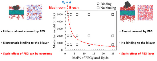 Our group simulated a mixture of lipids and PEGylated lipids at different molar ratios, showing the formation of self-assembled liposomes, bicelles, and micelles, respectively, at 0–2.2, 10.5–27.4, and higher mol% of PEGylated lipid, in qualitative agreement with experiments [167]. This indicates that the phase behavior and size of lipid assemblies can be modulated by PEG density because their bulky headgroups increase membrane curvature [167]. Moreover, our CG simulations of PEG chains grafted to a nonadsorbing surface captured the conformational transition between brush and mushroom states, showing good agreement of simulation and Alexander–de Gennes theory [25]. In particular, we characterized the extent of protein adsorption to PEGylated lipid bilayers in terms of different PEG sizes (Mw = 750, 2000, and 5000) and grafting densities (1.6–25 mol%), showing that the binding between proteins and membranes is suppressed by the PEG layer in a brush but not in a mushroom (Figure 7), in quantitative agreement with the Alexander–de Gennes theory and experiments regarding much less adsorption of plasma proteins onto the membrane surface grafted with PEG in the brush state than in the mushroom state [168]. It is worth noting that the binding between plasma protein and bilayer surface can be predicted from the boundary between mushroom and brush states of PEG with different sizes and grafting densities, as highlighted in Figure 7. Recently, Sammalkorpi and coworkers showed the formation of self-assembled liposomes, bicelles, and micelles at different PEGylated-lipid concentrations [169,170], similar to our previous work [167].