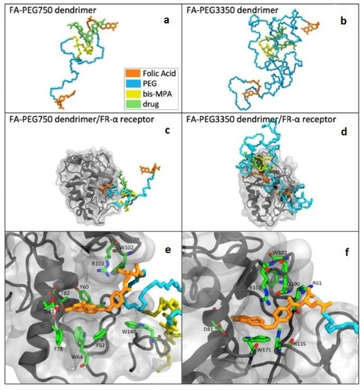 Snapshots of dendrimers complexed with drug, folic acid, and PEG ((a) PEG750 and (b) PEG3350), and those interacting with a folate receptor (c–f). (Reprinted with permission from [186]. Copyright (2017) Elsevier).