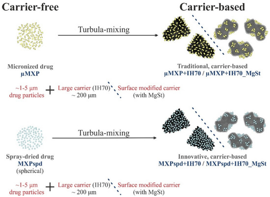 During spray drying, a Büchi Mini Spray Dryer B-191 (Büchi Labortechnik AG, Flawil, Switzerland) was used, based on our previous research [28]. The following main setting parameters were applied: the set temperature of the drying air (Tin) was 140 °C; the outlet temperature (Tout) was 78 °C, which is below the melting point of MXP; the drying air flow rate (Asp.) was 75%; the sample pump speed (Pump) was 5%, and the compressed air flow rate (Airflow) was 600 L/h. The yield was 54.3 ± 1.4%. The carrier-based DPI formulations were prepared using the two abovementioned carrier-free MXP formulations (μMXP and MXPspd) and carrier/surface-modified carrier, blended in a 1:10 [51] mass ratio by Turbula mixing (T2F Turbula System Schatz; Willy A. Bachofen AG Maschinenfabrik, Basel, Switzerland) with a 30 min blending time at 60 rpm [52]. The powder mixtures were prepared according to the rules of powder mixing before Turbula mixing. The surface modification of the carrier (IH70) was carried out with the application of 2.0 w/w% of MgSt compared to the final formulations—Table 1 [25,53]—with Turbula blending for 4 h [22]. Thus, MgSt can form a thin film coating the surface of the IH, which can modify its surface properties [22].