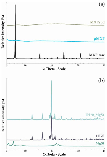 Investigation of the structural character of the applied drug and used excipients are also crucial for the understanding of their aerodynamic behavior, efficacy, compatibility of the API and the excipient, and the stability of the dosage form. XRPD studies provided useful information on the structure and crystallinity state of the mechanically micronized (μMXP) and the spray-dried (MXPspd) drug, which was applied in the studied samples. Based on the XRPD patterns (Figure 2a), the crystalline nature of the raw MXP was confirmed. MXP peaks were detected at the following 2Θ values: 6.04, 15.35, 24.52, and 30.94. In the case of µMXP and MXPspd, no peaks were observed according to the XRPD patterns, which reflected the amorphous nature of these formulations. After the micronization process, the crystallinity of the API broke down, and after the spray-drying, its crystalline structure did not build up again (because of the fast evaporation of the solvent); so, an amorphous state was achieved. The characteristic peaks of the excipients (Figure 2b) were investigated, too. These peaks were determined for MgSt at 3.8 and 5.5 2-Theta degrees and for IH70 at 12.8, 16.8, and 20.0 2-Theta degrees. In the case of the surface-treated carrier (IH70_MgSt), no structural change was detected compared to IH70.
