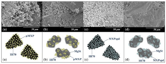 SEM recordings and schematic pictures of the carrier-based samples: (a) µMXP + IH70, (b) µMXP + IH70_MgSt, (c) MXPspd + IH70, and (d) MXPspd + IH70_MgSt.